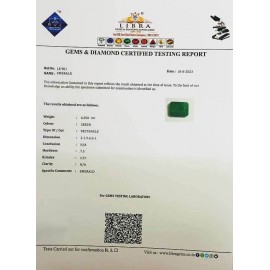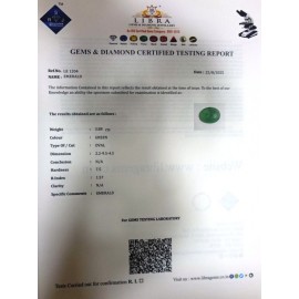 REPORT NO . LE 25CLARITY . N/ACOLOUR . GREENSHAPE / CUT . OVALWT . 4.57 CTSDIMENSION . 2-4.10-9.4-3.R . INDEX . 1.57HARDNESS . 7.5COMMENT . EMERALD..