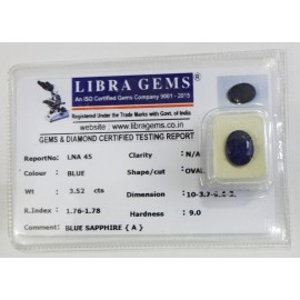 REPORT.NO.LNA 45CLARITY.N/ACOLOUR.BLUESHAPE/CUT.OVALWT.3.52 CTSDIMENSION.10.3-7.9-4.3R.INDEX.1.76-1.78HARDNESS.9.0COMMENT.BLUE SAPPHIRE {A]..
