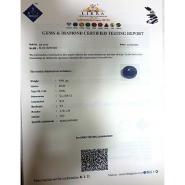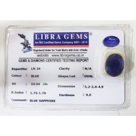 REPORT NO . LN 24CLARITY . N/ACOLOUR . BLUESHAPE / CUT . OVALWT . 10.04 CTSDIMENSION . 5-2.2-4.4-9.R . INDEX . 1.76-1.78HARDNESS . 9.0COMMENT . BLUE SAPPHIRE..