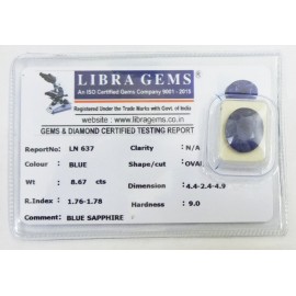 REPORT.NO.LN 637CLARITY.N/ACOLOUR.BLUESHAPE/CUT.OVAL WT.8.67 CTSDIMENSION.4.4-2.4-4.9R.INDEX.1.76-1.7.8HARDNESS.9.0COMMENT.BLUE SAPPHIRE..