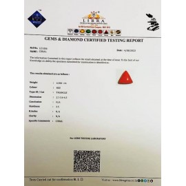 REPORT.NO.LCI 416CLARITY.N/ACOLOUR.REDSHAPE/CUT.TRIANGLEWT.5.64 CTSDIMENSION.2.6-1.8-6.6R.INDEX.N/AHARDNESS.3.5COMMENT.CORAL..