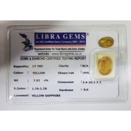 REPORT NO . LY 365CLARITY . N/ACOLOUR . YELLOWSHAPE / CUT . OVALWT . 7.62 CTSDIMENSION . 3-4.10-3.5-4.R . INDEX . 1.76-1.78HARDNESS . 9.0COMMENT . YELLOW SAPPHIRE..