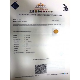 REPORT.NO.LY 410CLARITY.N/ACOLOUR.YELLOWSHAPE/CUT.OVALWT.5.75 CTSDIMENSION.10.7-8.5-6.3R.INDEX.1.76-1.78HARDNESS.9.0COMMENT.YELLOW SAPPHIRE..