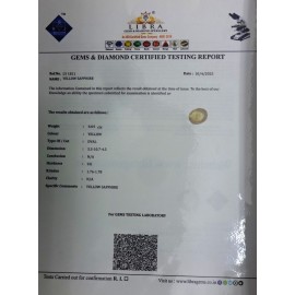 REPORT NO . LY 221CLARITY . N/ACOLOUR . YELLOWSHAPE / CUT . OVALWT . 3.39 CTSDIMENSION . 8-9.7-9.4-9.R . INDEX . 1.76-1.78HARDNESS . 9.0COMMENT . YELLOW SAPPHIRE..
