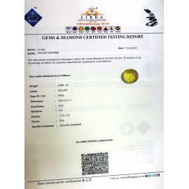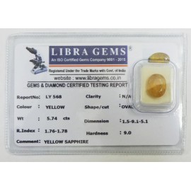 REPORT.NO.LY 568CLARITY.N/ACOLOUR.YELLOWSHAPE/CUT.OVAL WT.5.74 CTSDIMENSION.1.5-9.1-5.1R.INDEX.1.76-1.7.8HARDNESS.9.0COMMENT.YELLOW SAPPHIRE..