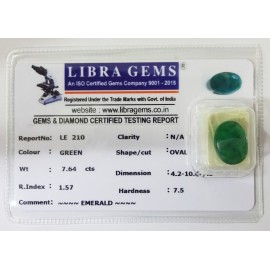 REPORT.NO.-LE 210CLARITY.-N/ACOLOUR.-GREENSHAPE/CUT.-OVALWT.-7.64 CTSDIMENSION.-4-2.10-6.7-3.R.INDEX.-1.57HARDNESS.-7.5COMMENT.-EMERALD..