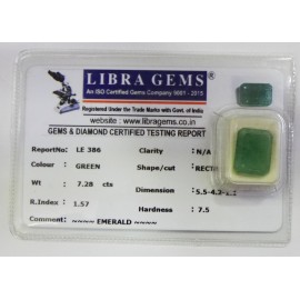 REPORT.NO.LE 386CLARITY.N/ACOLOUR.GREENSHAPE/CUT.RECTANGLEWT.7.28 CTSDIMENSION. 5-5.4-2.1-1.R.INDEX.1.57HARDNESS.7.5COMMENT.EMERALD..