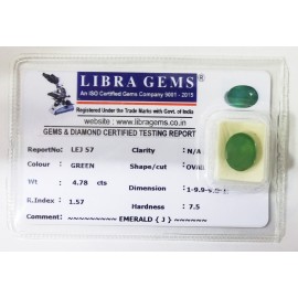 REPORT NO . LEJ 57CLARITY . N/ACOLOUR . GREENSHAPE / CUT . OVALWT . 4.78 CTSDIMENSION . 1-9.9-9.6-1.R . INDEX . 1.57HARDNESS . 7.5COMMENT . EMERALD { J }..