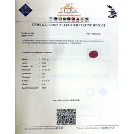 REPORT NO . LR 40CLARITY . N/ACOLOUR . PINKSHAPE / CUT . OVALWT . 7.02 CTSDIMENSION . 3-3.1-7.4-4.R . INDEX . 1.76-1.78HARDNESS . 9.0COMMENT . RUBY ..