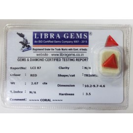 REPORT NO . LCI 87CLARITY . N/ACOLOUR . REDSHAPE / CUT .  TRIANGLEWT . 2.67 CTSDIMENSION . 10-2.9-7.4-6.R . INDEX . N/AHARDNESS . 3.5COMMENT . CORAL..