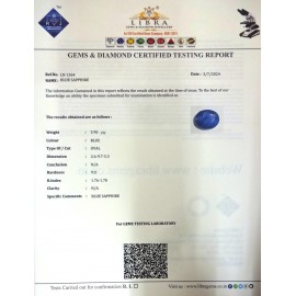 DATE:2025REF.NO:LN 1605NAME:BLUE SAPPHIREWEIGHT:6.34 CTSCOLOUR:BLUETYPE OF/CUT:OVALDIMENSION:3-3.9-2.6-4.CONCLUSION:N/AHARDNESS:9.0R.INDEX:1.76-1.78CLARITY:N/ASPECIFIC COMMENTS:BLUE SAPPHIRE..