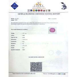 REPORT NO . LR 98CLARITY . N/ACOLOUR . PINKSHAPE / CUT . OVALWT . 5.05 CTSDIMENSION . 10-5.8-2.5-5.R . INDEX . 1.76-1.78HARDNESS . 9.0COMMENT . RUBY..