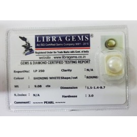 REPORT NO . LP 250CLARITY . N/ACOLOUR . SHINING WHITESHAPE / CUT . ROUNDWT . 9.08 CTSDIMENSION . 1-5.1-4.8-7.R . INDEX . N/AHARDNESS . 3.0COMMENT . PEARL..