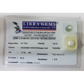 REPORT NO . LP 319CLARITY . N/ACOLOUR . SHINING WHITESHAPE / CUT . ROUNDWT . 2.78 CTSDIMENSION . 8-1.8-2.5-1.R . INDEX . N/AHARDNESS . 3.0COMMENT . PEARL..