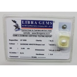 REPORT NO . LP 698CLARITY . N/ACOLOUR . SHINING WHITESHAPE / CUT . ROUNDWT . 3.85 CTSDIMENSION . 8-5.8-1.6-6.R . INDEX . N/AHARDNESS . 3.0COMMENT . PEARL..