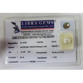 REPORT NO . LP 840CLARITY . N/ACOLOUR . SHINING WHITESHAPE / CUT . ROUNDWT . 4.18 CTSDIMENSION . 8-9.6-9.8-9.R . INDEX . N/AHARDNESS . 3.0COMMENT . PEARL..