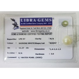 REPORT NO . LPS 97CLARITY . N/ACOLOUR . SHINING WHITESHAPE / CUT . ROUNDWT . 11.27 CTSDIMENSION . 1-4.1-5.1-5.R . INDEX . N/AHARDNESS . 3.0COMMENT . C / WATER PEARL { SOSI }..