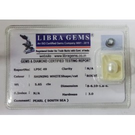 REPORT NO . LPSC 49CLARITY . N/ACOLOUR . SHINING WHITESHAPE / CUT . ROUNDWT . 5.65 CTSDIMENSION . 8-6.10-1.8-6.R . INDEX . N/AHARDNESS . 3.0COMMENT . PEARL { SOUTH SEA }..