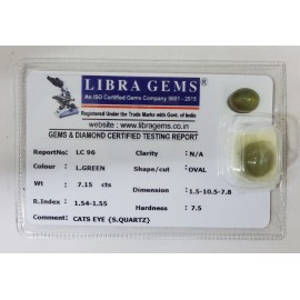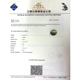 REPORT NO . LC 96CLARITY . N/ACOLOUR . L . GREENSHAPE / CUT . ROUNDWT . 7.15 CTSDIMENSION . 1-5.10-5.7-8.R . INDEX .1.54-1.55HARDNESS . 7.5COMMENT . CATS EYE { S . SQUARTZ } ..