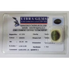 REPORT NO . LC 276CLARITY . N/ACOLOUR . GREENSHAPE / CUT . OVALWT . 10.35 CTSDIMENSION . 2-2.4-5.8-2.R . INDEX . 1.54-1.55HARDNESS . 7.5COMMENT . CATS EYE { S . QUARTZ }..