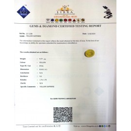 REPORT NO . LY 23CLARITY . N/ACOLOUR . YELLOWSHAPE / CUT . OVALWT . 3.81 CTSDIMENSION . 9-2.8-2.5-3.R . INDEX . 1.76-1.78HARDNESS . 9.0COMMENT . YELLOW SAPPHIRE..