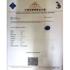 REPORT.NO. LN 827CLARITY.N/ACOLOUR.BLUESHAPE/CUT.OVALWT.18.90 CTSDIMENSION.4.5-2.8-8.1R.INDEX.1.76-1.78HARDNESS.9.0COMMENT.BLUE SAPPHIRE..