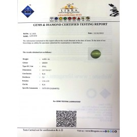 DATE:11-10-2023REF.NO:LC 890NAME:CATS EYE WEIGHT:4.84 CTSCOLOUR:GREENTYPE OF/CUT:OVALDIMENSION:1.1-10.2-6.2CONCLUSION:N/AHARDNESS:7.5R.INDEX:1.54-1.55CLARITY:N/ASPECIFIC COMMENTS:CATS E..