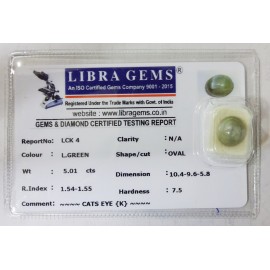 REPORT NO . LCK 4CLARITY . N/ACOLOUR . L . GREENSHAPE / CUT . ROUNDWT . 5.01 CTSDIMENSION . 10-4.9-6.5-8.R . INDEX . 1.54-1.55HARDNESS . 7.5COMMENT . CATS EYE { K }..