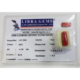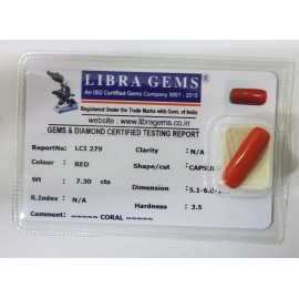 REPORT NO . LCI 220CLARITY . N/ACOLOUR . REDSHAPE / CUT . CAPSULEWT . 4.94 CTSDIMENSION . 6-5.5-4.6-1.R . INDEX . N/AHARDNESS . 3.5COMMENT . CORAL..