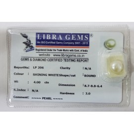 REPORT NO . LP 206CLARITY . N/ACOLOUR . SHINING WHITESHAPE / CUT . ROUNDWT . 4.00 CTSDIMENSION . 8-7.8-8.6-4.R . INDEX . N/AHARDNESS . 3.0COMMENT . PEARL..