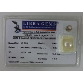 REPORT NO . LP 520CLARITY . N/ACOLOUR . SHINING WHITESHAPE / CUT . ROUNDWT . 4.74 CTSDIMENSION . 9-5.9-4.6-3.R . INDEX . N/AHARDNESS . 3.0COMMENT . PEARL..