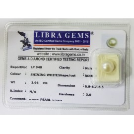 REPORT NO . LP 948CLARITY . N/ACOLOUR . SHINING WHITESHAPE / CUT . ROUNDWT . 3.96 CTSDIMENSION . 8-8.8-7.6-5.R . INDEX . N/AHARDNESS . 3.0COMMENT . PEARL..