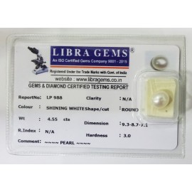 REPORT NO . LP 988CLARITY . N/ACOLOUR . SHINING WHITESHAPE / CUT . ROUNDWT . 4.55 CTSDIMENSION . 9-3.8-7.7-1.R . INDEX . N/AHARDNESS . 3.0COMMENT . PEARL..