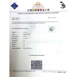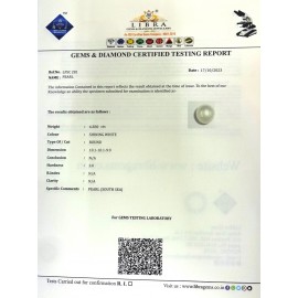 REPORT.NO.LP 1176CLARITY.N/A COLOUR.SHINING WHITE SHAPE/CUT.ROUND WT.6.68 CTS DIMENSION.10.5-10.5-7.4R.INDEX.N/AHARDNESS.3.0COMMENT.PEARL ..
