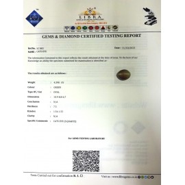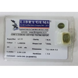 REPORT.NO.-LC 568CLARITY.-N/ACOLOUR.-L. GREENSHAPE/CUT.-OVALWT.-6.47 CTSDIMENSION.-2-4.10-2.7-4.R.INDEX.-1.54-1.55HARDNESS.-7.5COMMENT.-CATS EYE { S. QUARTZ }..