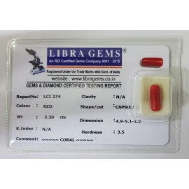 REPORT NO . LCI 274CLARITY . N/ACOLOUR . REDSHAPE / CUT . CAPSULEWT . 3.20 CTSDIMENSION . 4-9.5-1.3-2.R . INDEX . N/AHARDNESS . 3.5COMMENT . CORAL..