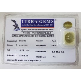 REPORT NO . LC 105CLARITY . N/ACOLOUR . L . GREENSHAPE / CUT . OVALWT . 5.25 CTSDIMENSION . 1-3.10-2.6-2.R . INDEX . 1.54-1.55HARDNESS . 7.5COMMENT . CATS EYE { S . QUARTZ }..