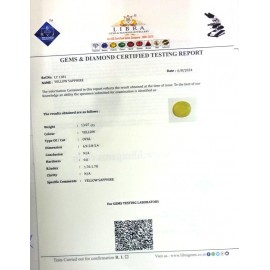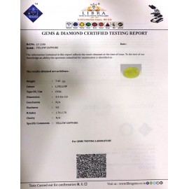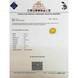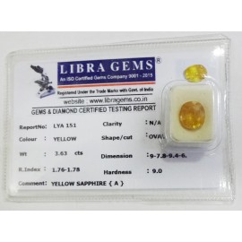 REPORT.NO.-LYA 151CLARITY.-N/ACOLOUR.-YELLOWSHAPE/CUT.-OVALWT.-3.63 CTSDIMENSION.-9-7.8-9.4-6.R.INDEX.-1.76-1.78HARDNESS.-9.0COMMENT.-YELLOW SAPPHIRE { A }..