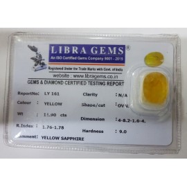 REPORT NO . LY 161CLARITY . N/ACOLOUR . YELLOWSHAPE / CUT . OVALWT . 11.90 CTSDIMENSION . 4-8.2-1.6-4.R . INDEX . 1.76-1.78HARDNESS . 9.0COMMENT . YELLOW SAPPHIRE..