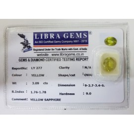 REPORT NO . LY 277CLARITY . N/ACOLOUR . YELLOWSHAPE / CUT . OVALWT . 3.09 CTSDIMENSION . 9-2.7-3.4-6.R . INDEX . 1.76-1.78HARDNESS . 9.0COMMENT . YELLOW SAPPHIRE..