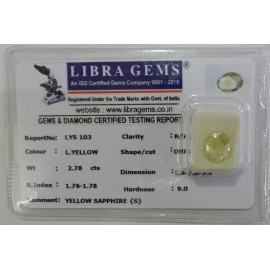 REPORT.NO.-LYS 103CLARITY.-N/ACOLOUR.-L. YELLOWSHAPE/CUT.-OVALWT.-2.78 CTSDIMENSION.-9-9.7-8.3-9.R.INDEX.-1.76-1.78HARDNESS.-9.0COMMENT.-YELLOW SAPPHIRE { S }..