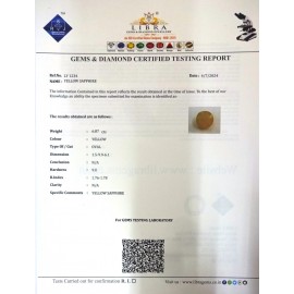 DATE:4-7-2024REF.NO:LY 1234NAME:YELLOW SAPPHIREWEIGHT:6.87 CTSCOLOUR:YELLOWTYPE OF/CUT:OVALDIMENSION:1.5-9.9-6.1CONCLUSION:N/AHARDNESS:9.0R.INDEX:1.76-1.78CLARITY:N/ASPECIFIC COMMENTS:YELLOW..
