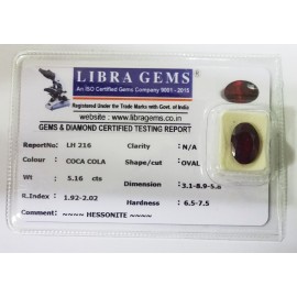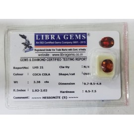 REPORT NO . LHS 21CLARITY . N/ACOLOUR . COCA COLASHAPE / CUT . OVALWT . 3.38 CTSDIMENSION . 9-7.8-5.4-8.R . INDEX . 1.92-2.02HARDNESS . 6.5-7.5COMMENT . HESSONITE { S }..