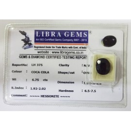 REPORT.NO.-LH 375CLARITY.-N/ACOLOUR.-COCA COLASHAPE/CUT.-OVALWT.-6.75 CTSDIMENSION.-1-6.9-8.6-6.R.INDEX.-1.92-2.02HARDNESS.-6.5-7.5COMMENT.-HESSONITE..