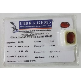 REPORT NO . LH 92CLARITY . N/ACOLOUR . COCA COLASHAPE / CUT . OVALWT . 4.33 CTSDIMENSION . 2-4.8-6.4-1.R . INDEX . 1.92-2.02HARDNESS . 6.5-7.5COMMENT . HESSONITE..