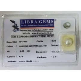 REPORT NO . LP 1069CLARITY . N/ACOLOUR . SHINING WHITESHAPE / CUT . ROUNDWT . 4.21 CTSDIMENSION . 9-1.6-5.9-1.R . INDEX . N/AHARDNESS . 3.0COMMENT . PEARL..