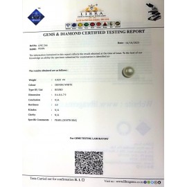REPORT NO . LPSC 6CLARITY . N/ACOLOUR . SHINING WHITESHAPE / CUT . ROUNDWT . 5.21 CTSDIMENSION . 9-1.8-4.9-9.R . INDEX . N/AHARDNESS . 3.0COMMENT . PEARL { SOUTH SEA }..