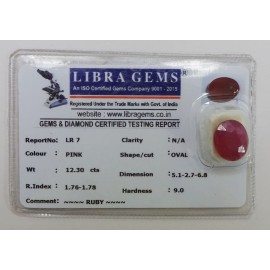 REPORT NO . LR 7CLARITY . N/ACOLOUR . PINKSHAPE / CUT . OVALWT . 12.30 CTSDIMENSION . 5-1.2-7.6-8.R . INDEX . 1.76-1.78HARDNESS . 9.0COMMENT . RUBY..