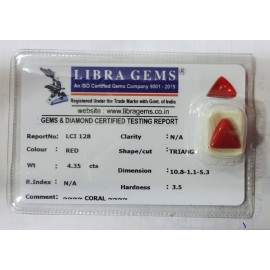 REPORT.NO.LCI 546CLARITY.N/ACOLOUR.REDSHAPE/CUT.TRIANGLE WT.6.81 CTS DIMENSION.3.8-3.2-5.8R.INDEX.N/AHARDNESS.3.5COMMENT.CORAL ..