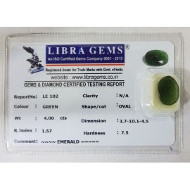 REPORT NO . LE 102CLARITY . N/ACOLOUR . GREENSHAPE / CUT . OVALWT . 4.00 CTSDIMENSION . 3-7.10-1.4-5.R . INDEX . 1.57HARDNESS . 7.5COMMENT . EMERALD..